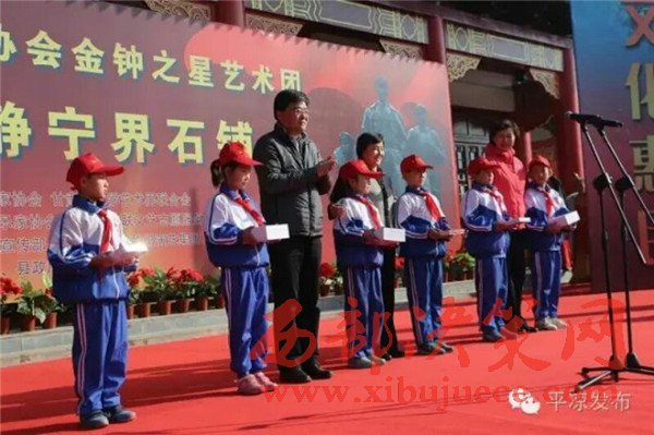 11月3日,在全國上下認真學(xué)習(xí)貫徹黨的十八屆六中全會精神、隆重紀念紅軍長征勝利80周年之際,由中國音樂家協(xié)會、甘肅省文聯(lián)主辦,甘肅省音樂家協(xié)會、甘肅省文聯(lián)文藝志愿者服務(wù)團、平?jīng)鍪形麄鞑?、平?jīng)鍪形穆?lián)承辦,靜寧縣委、縣政府協(xié)辦的“長征精神代代傳——中國音協(xié)金鐘之星藝術(shù)團‘送歡樂·下基層’慰問演出活動”在靜寧縣界石鋪紅軍長征毛澤東舊居紀念館演出。