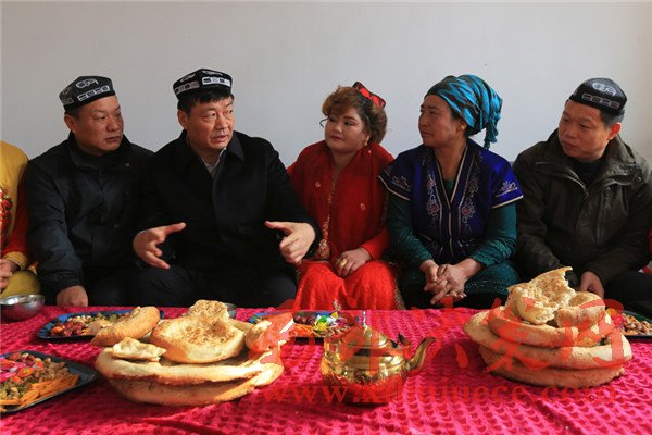 在巴哈爾古麗·吾斯曼家中,董斌與“親戚”一家促膝長(zhǎng)談,“心連心”交流,詳細(xì)了解今年家庭收入情況以及今后的生產(chǎn)計(jì)劃,并囑咐孩子們要多學(xué)習(xí)生產(chǎn)生活技能,勇于承擔(dān)起家庭脫貧致富的擔(dān)子,照顧好家庭和家人。董斌說,“現(xiàn)在黨的惠民政策這么好,一定要靠自己的雙手勤勞致富,努力過上好日子。同時(shí)發(fā)展好庭院經(jīng)濟(jì),在庭院內(nèi)多種植蔬菜、果樹,建好雞舍、羊圈,多發(fā)展家禽和牛羊,多渠道的增收致富。”巴哈爾古麗·吾斯曼一家表示,要常懷感恩之心,感謝黨的惠民好政策,感謝親人的關(guān)心和幫助,帶頭搞好民族團(tuán)結(jié),勤勞務(wù)實(shí),爭(zhēng)取早日脫貧致富。