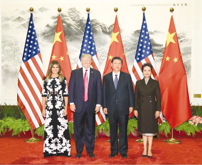 11月9日,國家主席習(xí)近平在北京人民大會堂東門外廣場舉行歡迎儀式,歡迎美利堅(jiān)合眾國總統(tǒng)唐納德·特朗普對中國進(jìn)行國事訪問。這是習(xí)近平和夫人彭麗媛在人民大會堂同特朗普夫婦合影。(記者 蘭紅光 攝)