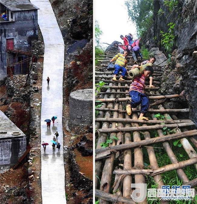 2012年9月3日,廣西大化瑤族自治縣板升鄉(xiāng)弄勇村弄頂屯的孩子們扛著生活用具去學校(右圖);2017年1月11日,水泥公路已經(jīng)從學校修通到家門口(左圖)。隨著脫貧攻堅工作不斷推進,原本“千重山,萬層嶺,不通水,不通電”的廣西大石山區(qū)發(fā)生了翻天覆地的變化。記者黃孝邦攝