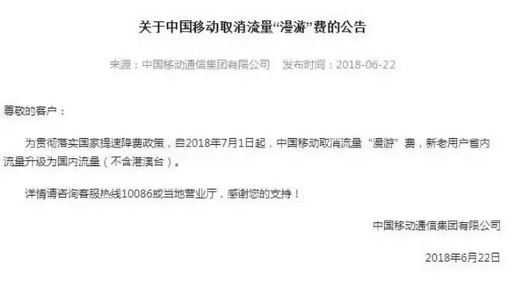 6月22日,中國移動(dòng)、中國聯(lián)通和中國電信先后宣布自7月1日起取消流量“漫游”費(fèi),手機(jī)用戶省內(nèi)流量升級(jí)為國內(nèi)流量(不含港澳臺(tái))。