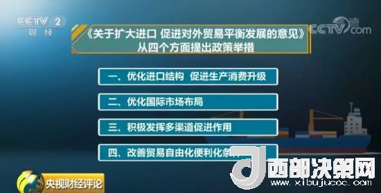 日前,國務(wù)院辦公廳轉(zhuǎn)發(fā)商務(wù)部等20個(gè)部門《關(guān)于擴(kuò)大進(jìn)口 促進(jìn)對外貿(mào)易平衡發(fā)展的意見》?!兑庖姟窂乃膫€(gè)方面提出政策舉措:一是優(yōu)化進(jìn)口結(jié)構(gòu),促進(jìn)生產(chǎn)消費(fèi)升級;二是優(yōu)化國際市場布局;三是積極發(fā)揮多渠道促進(jìn)作用;四是改善貿(mào)易自由化便利化條件。其中,在優(yōu)化進(jìn)口結(jié)構(gòu)方面,提出了四個(gè)方向,包括:支持關(guān)系民生的產(chǎn)品進(jìn)口、積極發(fā)展服務(wù)貿(mào)易、增加有助于轉(zhuǎn)型發(fā)展的技術(shù)裝備進(jìn)口、增加農(nóng)產(chǎn)品和資源性產(chǎn)品進(jìn)口。