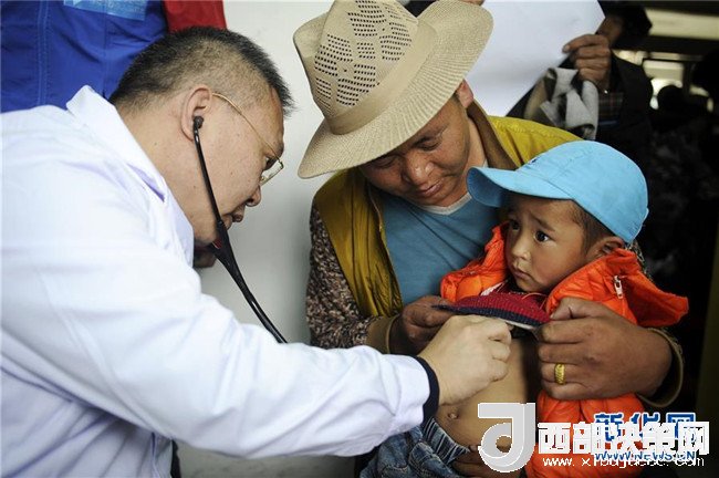 7月11日,在西藏那曲,醫(yī)療專家為貧困先心病患兒做檢查。