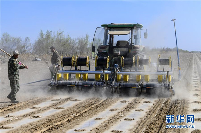 在新疆生產(chǎn)建設(shè)兵團(tuán)第六師共青團(tuán)農(nóng)場的棉花地中,一名農(nóng)場職工在一輛裝有北斗導(dǎo)航系統(tǒng)的多功能一體化無人駕駛精量播種機(jī)后檢查地膜鋪設(shè)情況(4月19日攝)。