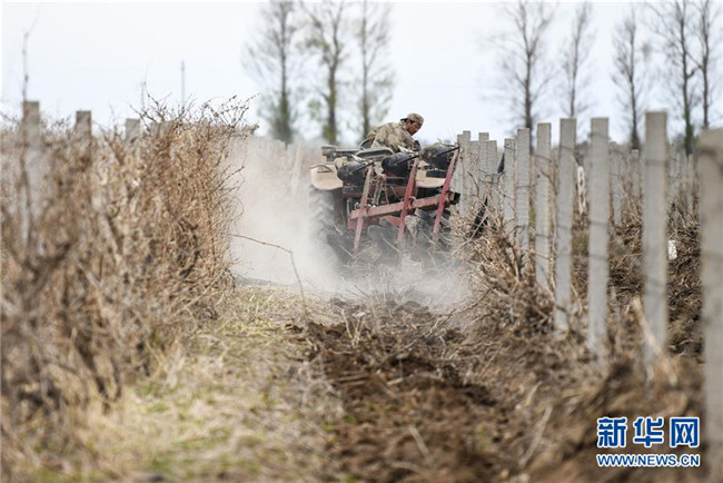 在新疆生產(chǎn)建設(shè)兵團(tuán)第六師共青團(tuán)農(nóng)場的葡萄地中,一名農(nóng)機(jī)手操縱一輛小型農(nóng)機(jī)在犁地(4月22日攝)。