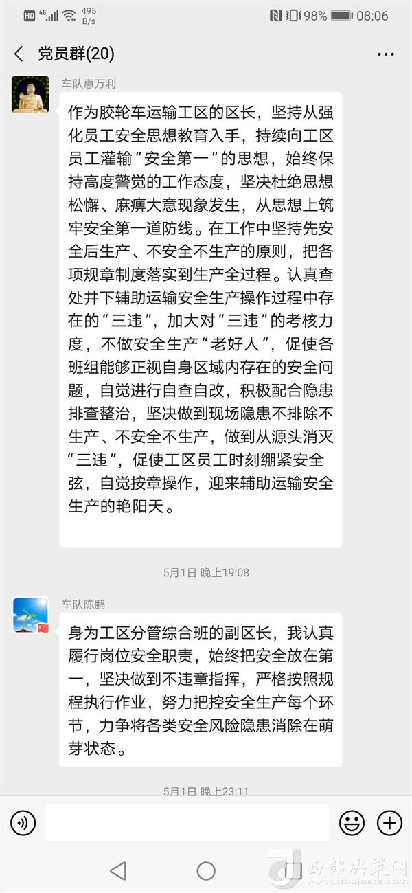 西部決策網(wǎng)訊(記者王瑞鵬 通訊員 張亞濤)為更好地發(fā)揮基層黨支部戰(zhàn)斗堡壘作用、廣大黨員先鋒模范作用,5月份,陜北礦業(yè)檸條塔公司膠輪車運(yùn)輸工區(qū)開展“講安全、抓安全”主題黨日活動。該支部按照“全員學(xué)習(xí)、座談討論、結(jié)合崗位實(shí)際”的學(xué)習(xí)方式,全面深入開展“吸取教訓(xùn)、查擺問題、整改落實(shí)、確保安全”主題黨日活動。
