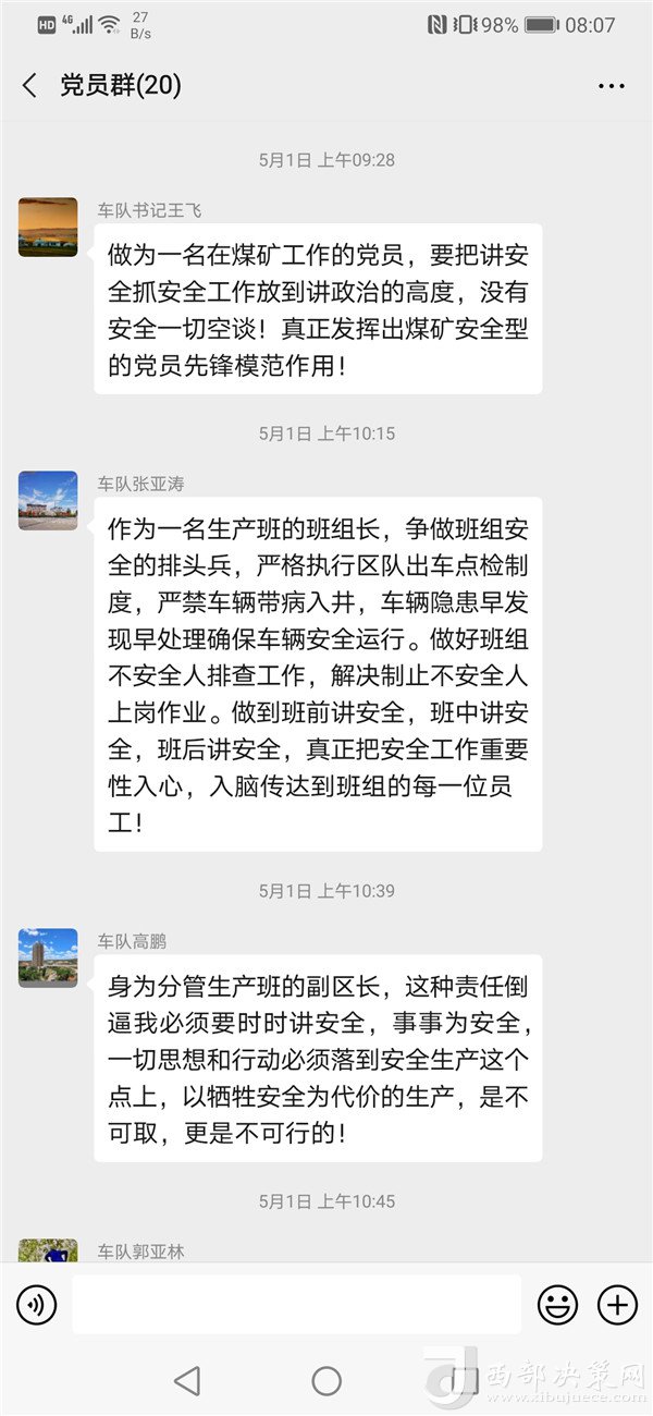 活動期間,支部20名黨員認(rèn)真學(xué)習(xí)貫徹集團(tuán)公司、陜北礦業(yè)公司和公司近期安全生產(chǎn)文件材料宣貫落實(shí)精神,深刻吸取安全生產(chǎn)事故教訓(xùn),圍繞“守住安全生產(chǎn)這一‘生命線’,牢固確立‘四個最’的意識”工作目標(biāo),展開了圍繞分管業(yè)務(wù)、自身崗位特點(diǎn)的討論學(xué)習(xí)。此次主題黨日活動,支部黨員紛紛談體會、講心得,結(jié)合工作中遇到的經(jīng)典案例,剖析了自身工作存在的短板和不足,并提出了具體的改進(jìn)措施。同時,表示在今后工作中將充分發(fā)揮黨員的先鋒模范作用,擔(dān)當(dāng)作為、履職盡責(zé),做到帶頭反三違、帶頭降三違、身邊無三違。