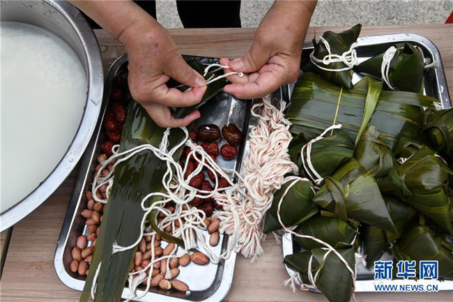 6月17日,水清溝街道居民在社區(qū)廣場上包粽子。新華社記者 李紫恒 攝